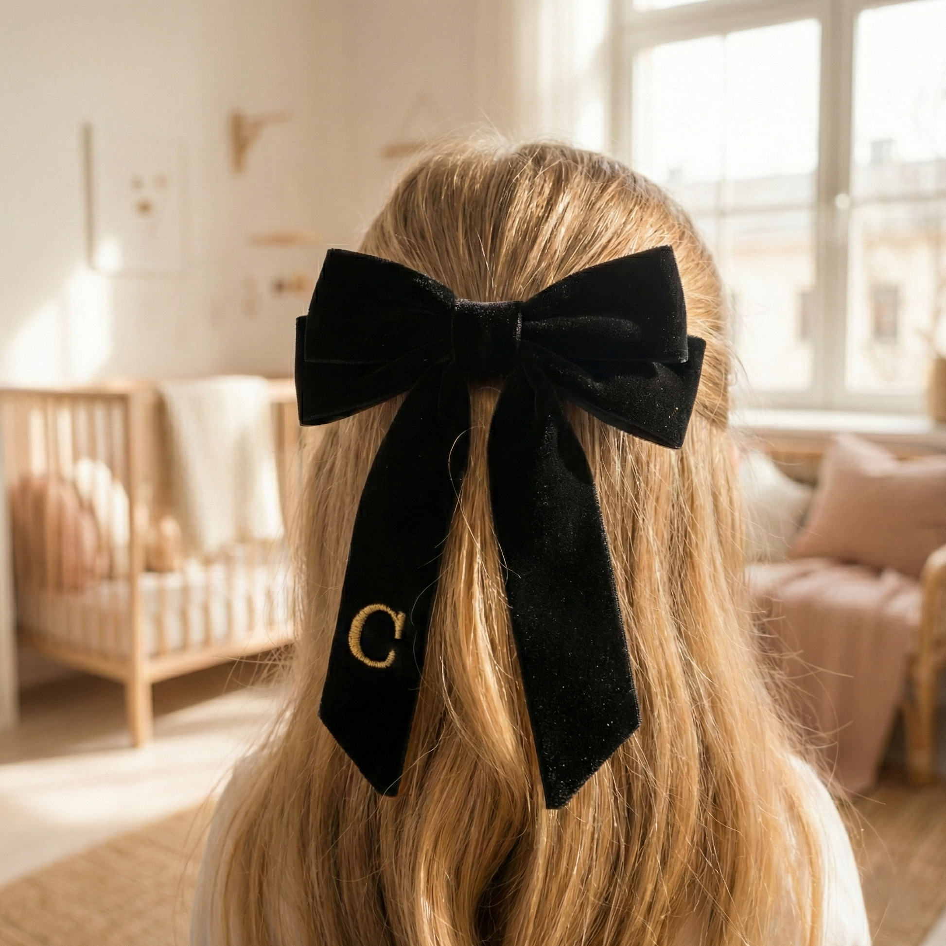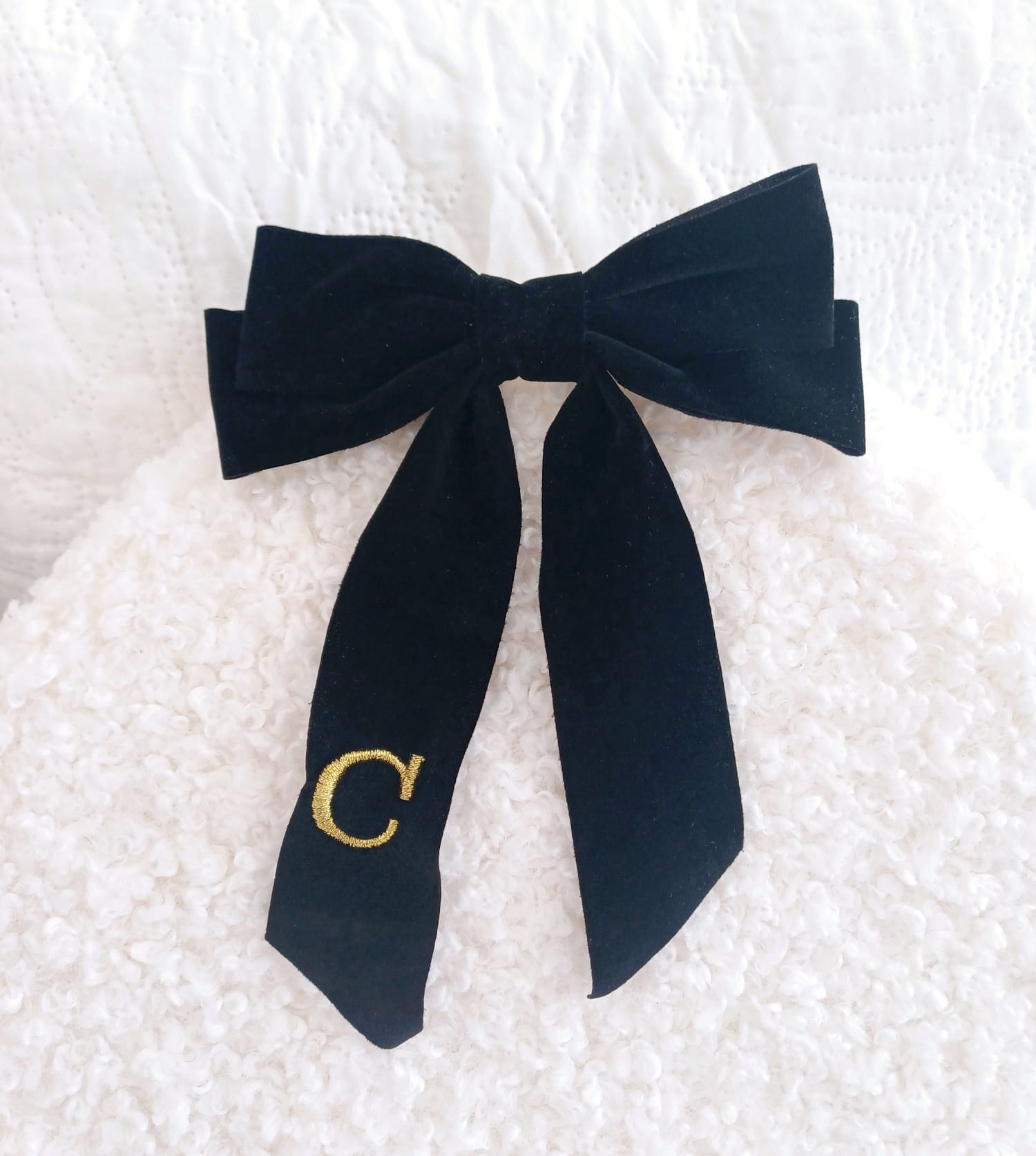 Verleihe deinem Look eine kokette und persönliche Note mit unserer bestickten Schleife, perfekt, um deine Frisuren zu vervollständigen oder jedem Outfit ein besonderes Detail zu verleihen.